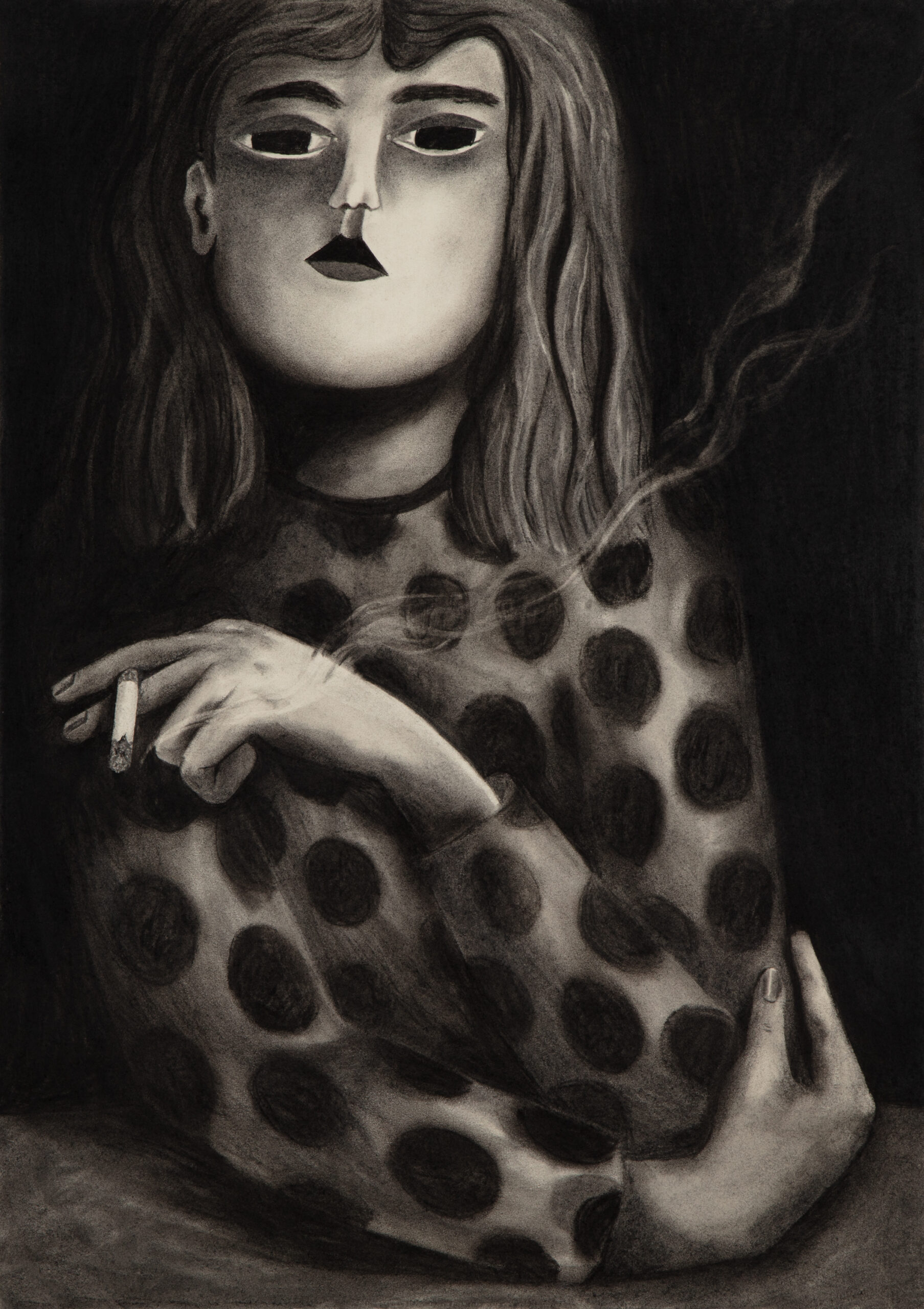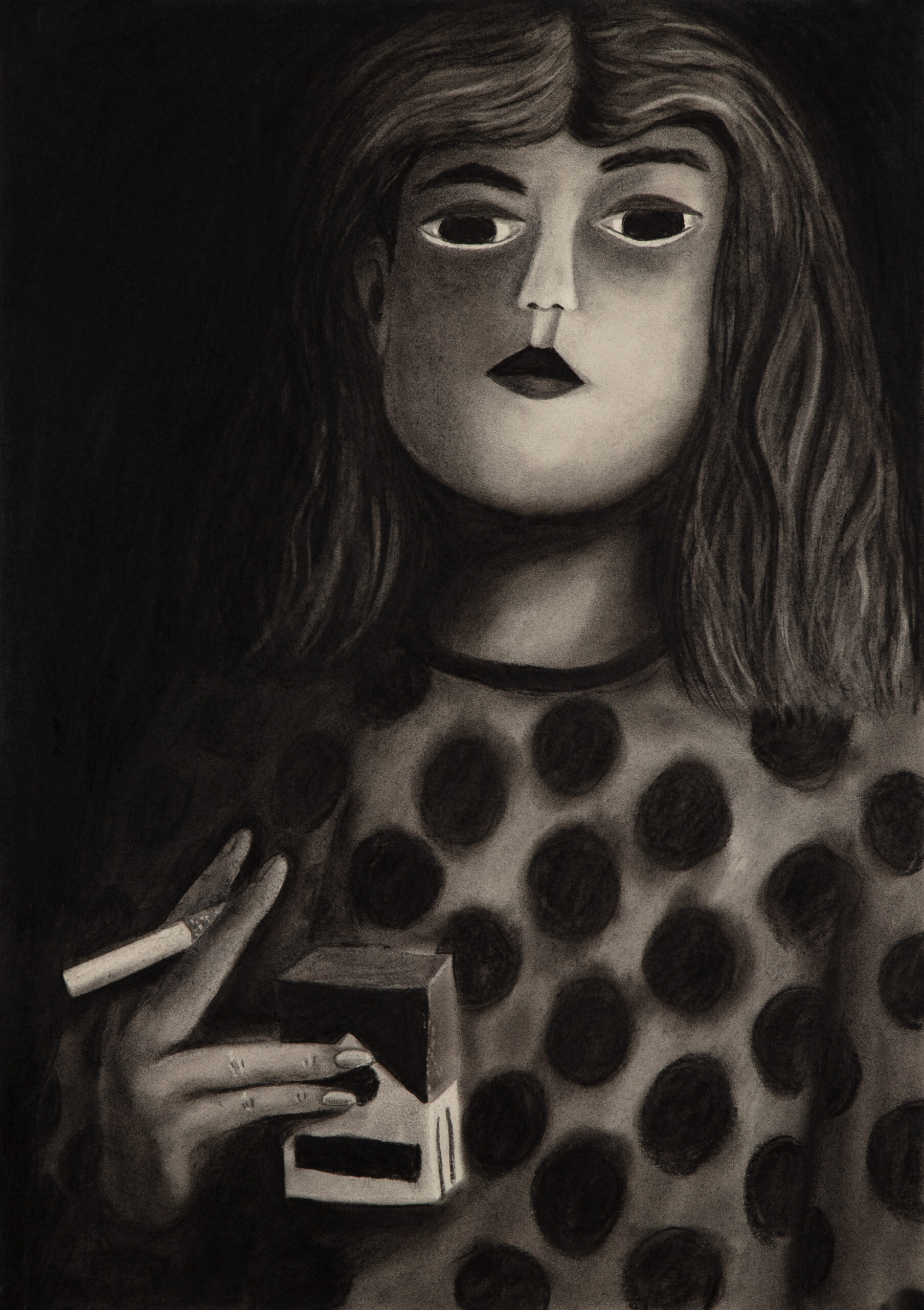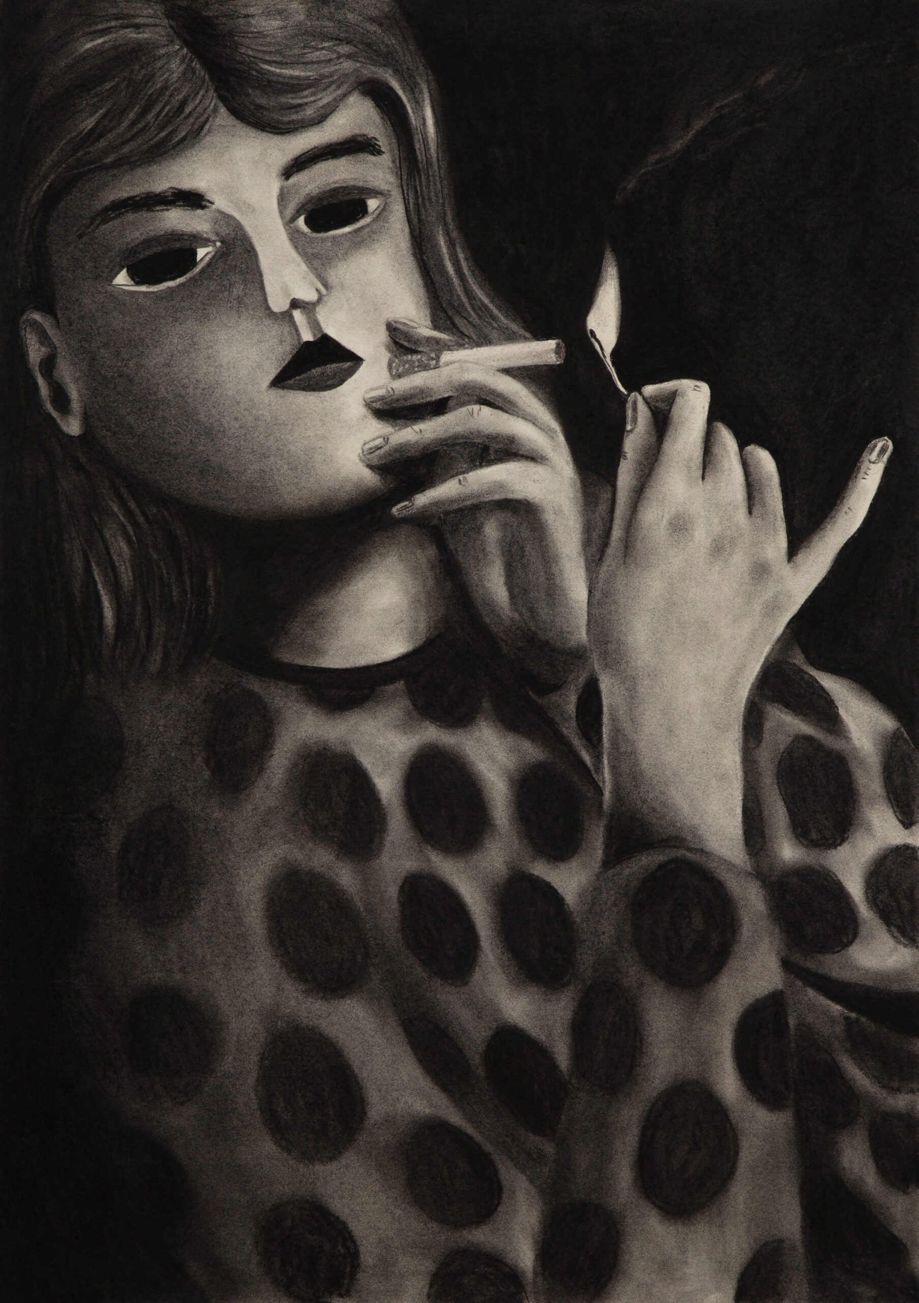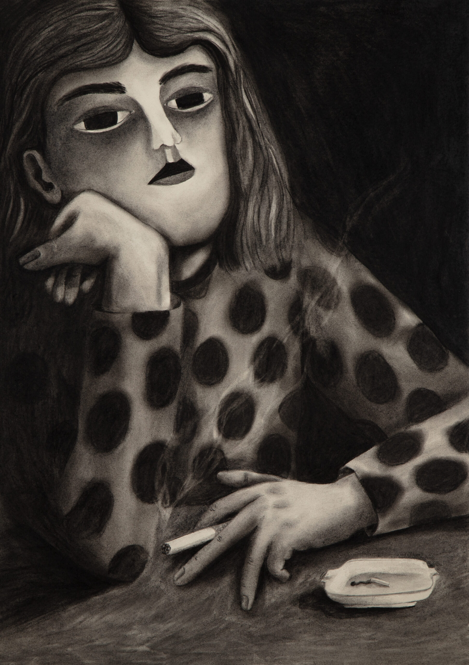 It is about a woman smoking a cigarette, but the story isn’t about smoking. Her pose is borrowed from art history, from the 19th century to today. Reference images, in order: Nan Goldin, Suzanne with Marlboro, 1980; Auguste Leveque, Portrait of Suzanne, 1866–1921; Édouard Manet, Plum Brandy, 1877; Alfred James Munnings, A Study of Miss Hancock, 1878–1959; Picasso, Young Woman Holding a Cigarette, 1901; Salvatore Fiume, A Susette, 1956; Fabio Hurtado, Travel Reading, 2010; Sarah Lucas, Fighting Fire with Fire, 1996.